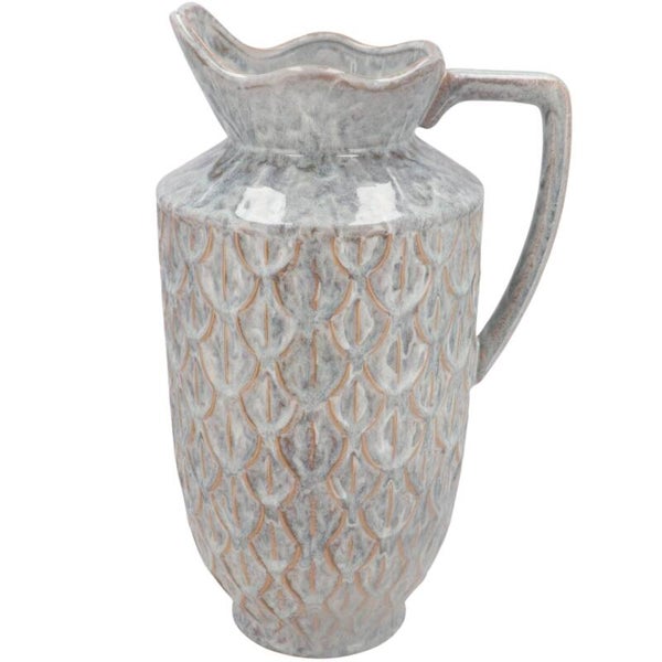 Keramieken vaas in kanvorm met een decoratief reliëfpatroon en golvende schenkrand. De afwerking zorgt voor een moderne uitstraling met een klassieke twist. Geschikt als decoratief accent of gevuld met droogbloemen. De vaas is waterdicht, maar wees voorzichtig met water inschenken. Is beschikbaar in de kleuren zwart, goud & ecru.