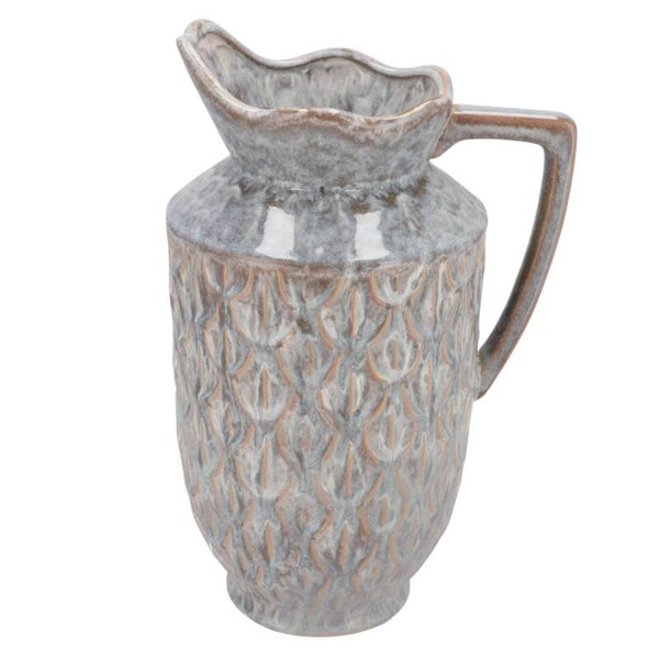 Keramieken vaas in kanvorm met een decoratief reliëfpatroon en golvende schenkrand. De afwerking zorgt voor een moderne uitstraling met een klassieke twist. Geschikt als decoratief accent of gevuld met droogbloemen. De vaas is waterdicht, maar wees voorzichtig met water inschenken. Is beschikbaar in de kleuren zwart, goud & ecru.