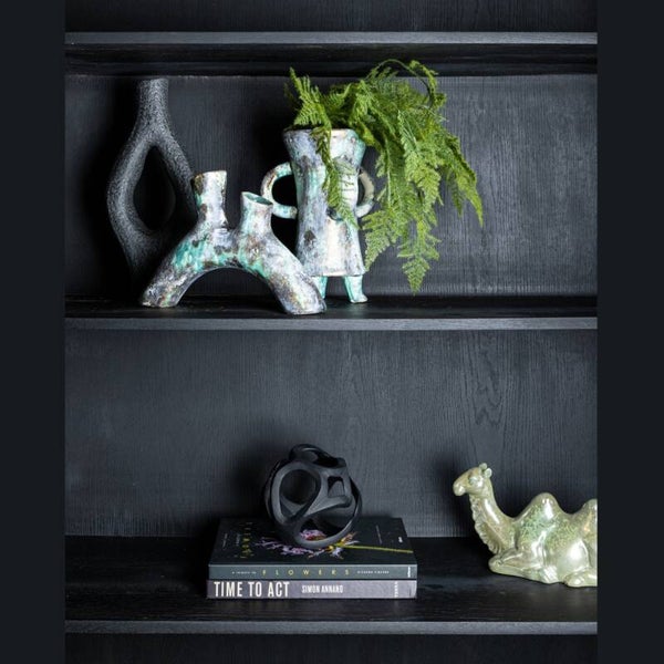 Keramieken vaas. Voorzien van pootjes en oren, afgewerkt in turquoise glazuur met antieke look. Past perfect in een interieur met brocante stijl.