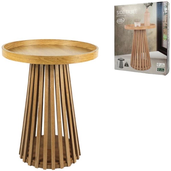 Deze stijlvolle bijzettafel is een perfecte aanvulling op elk interieur. Met een hoogte van 50 cm en een tafelblad van 40 cm diameter biedt deze tafel zowel functionaliteit als een modern design. De open houten constructie zorgt voor een luchtige en eigentijdse uitstraling. De maximale draagkracht is 2 kg. Ideaal als decoratieve tafel in de woonkamer, slaapkamer of hal.