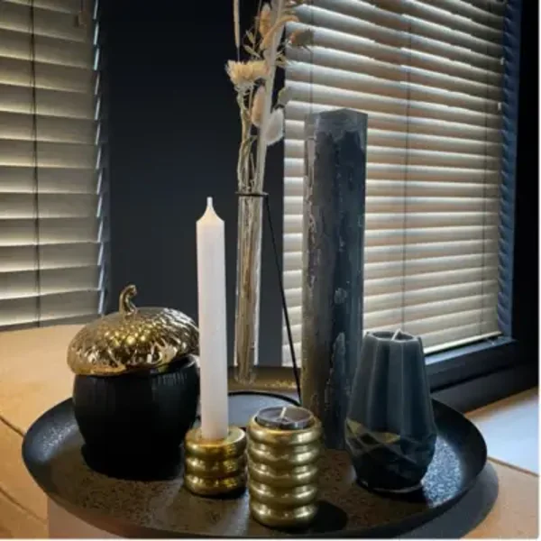 Deze grote ronde schaal heeft een diameter van 52 cm en is volledig uitgevoerd in metaal met een zwarte afwerking. De schaal is voorzien van een stijlvol patroon en past perfect in een tijdloos interieur. Ideaal voor het presenteren van kaarsen of decoratieve objecten op tafel of dressoir.